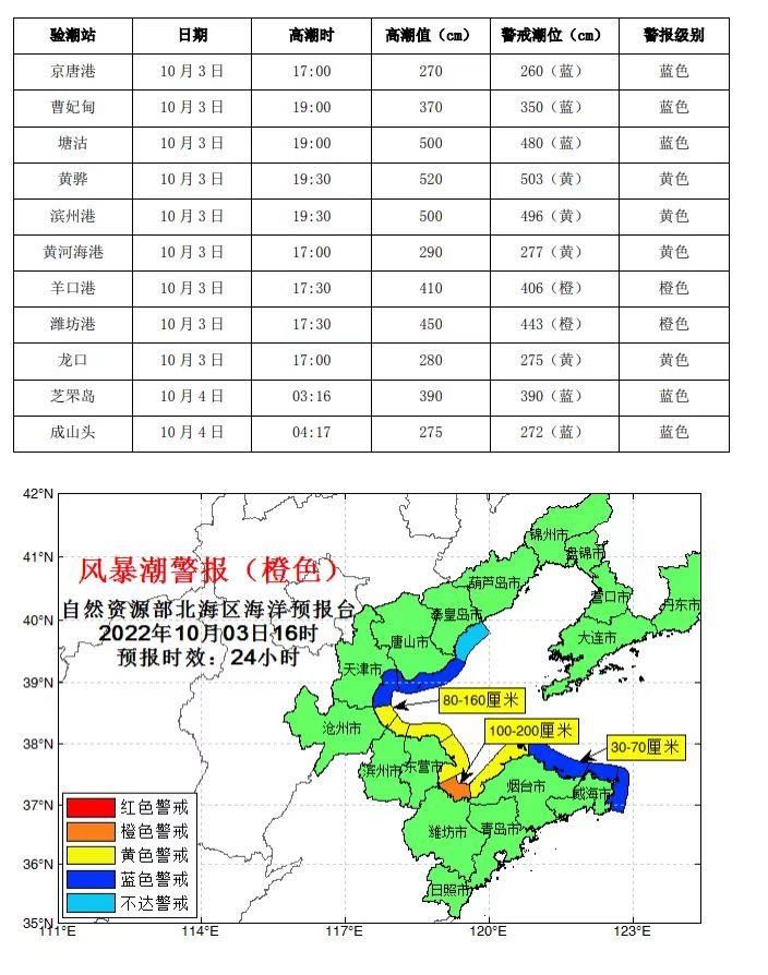 受强冷空气影响,预计10月3日下午至4日上午,渤海湾、莱州湾和山东半岛北部沿岸将分别出现80~160cm、100~200cm和30~70cm的风暴增水。羊口港和潍坊港验潮站将出现达到当地橙色警戒潮位的高潮位,黄骅、滨州港、黄河海港和龙口验潮站将出现达到当地黄色警戒潮位的高潮位,京唐港、曹妃甸、塘沽、芝罘岛和成山头验潮站将出现达到当地蓝色警戒潮位的高潮位。山东省潍坊市预警级别为橙色,河北省沧州市、山东省滨州市、东营市和烟台市预警级别为黄色,天津市、河北省唐山市、山东省威海市预警级别为蓝色。