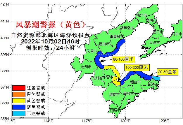 受强冷空气影响,预计10月3日上午至夜间,渤海湾、莱州湾和山东半岛北部沿岸将分别出现80—160cm、100—200cm和20—50cm的风暴增水。黄河海港、羊口港和潍坊港验潮站将出现达到当地黄色警戒潮位的高潮位,秦皇岛、京唐港、曹妃甸、塘沽、黄骅、滨州港和龙口验潮站将出现达到当地蓝色警戒潮位的高潮位。山东省东营市和潍坊市预警级别为黄色,天津市、河北省秦皇岛市、唐山市和沧州市、山东省滨州市和烟台市预警级别为蓝色。