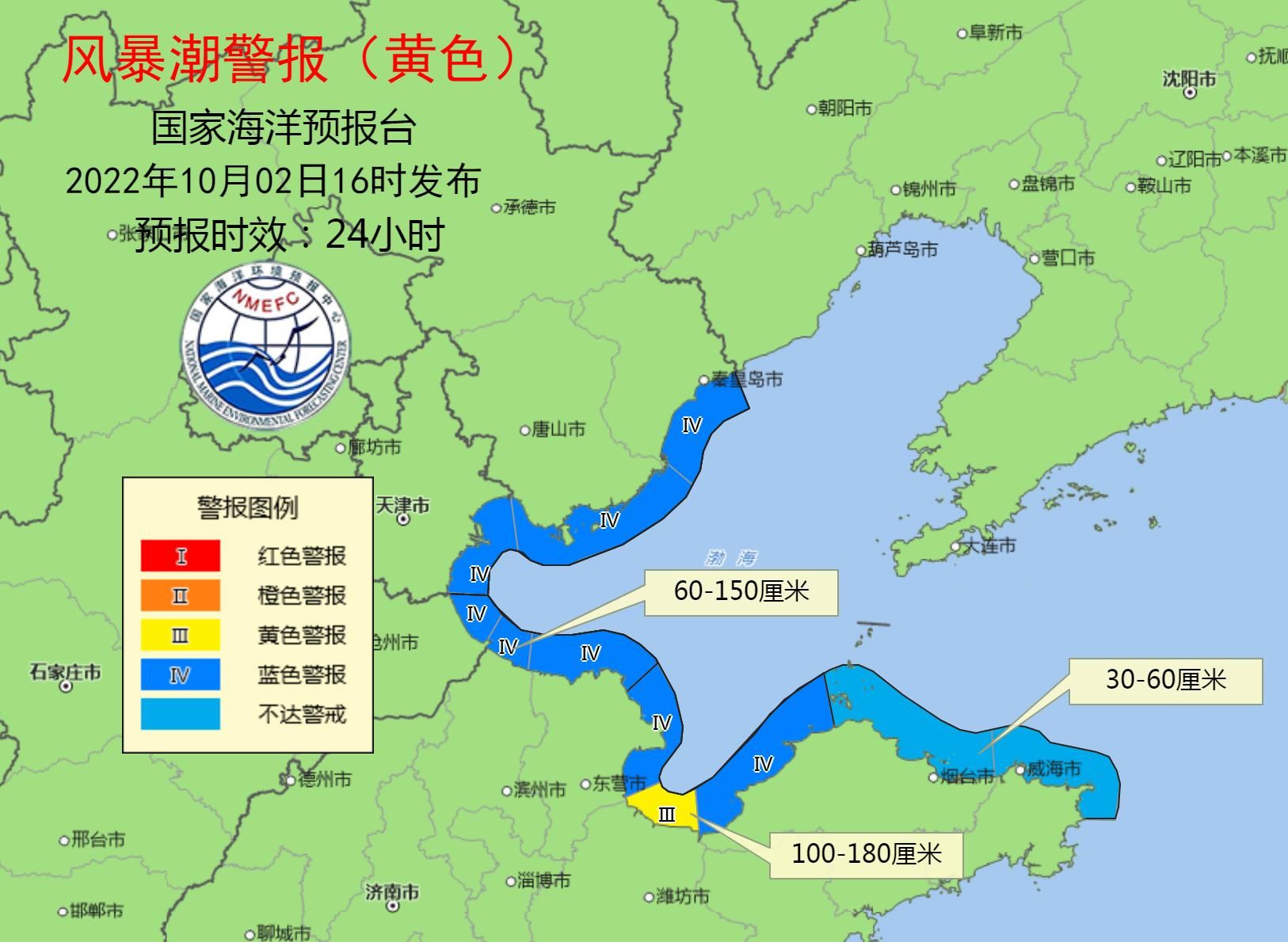 风暴潮方面,预计10月3日上午到傍晚,渤海湾将出现60-150厘米的风暴增水,莱州湾将出现100-180厘米的风暴增水,山东半岛北部沿海将出现30-60厘米的风暴增水。山东省潍坊市的风暴潮预警级别为黄色,天津市,河北省秦皇岛市、唐山市、沧州市,山东省滨州市、东营市和烟台市的风暴潮预警级别为蓝色。