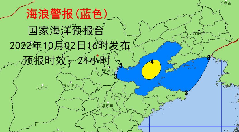 海浪方面,预计10月3日白天,渤海、黄海北部将出现2.5-4.5米的大浪到巨浪区;辽宁南部、河北、天津、山东北部近岸海域将出现2-3.4米的中浪到大浪,近岸海域海浪预警级别为蓝色。国家海洋预报台提醒在上述海域作业的船只,需注意安全,沿海各有关单位应提前采取防浪避浪措施。